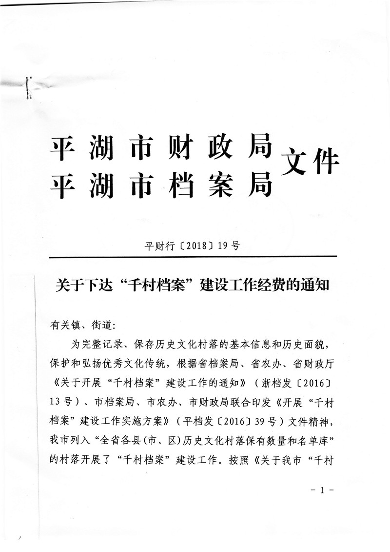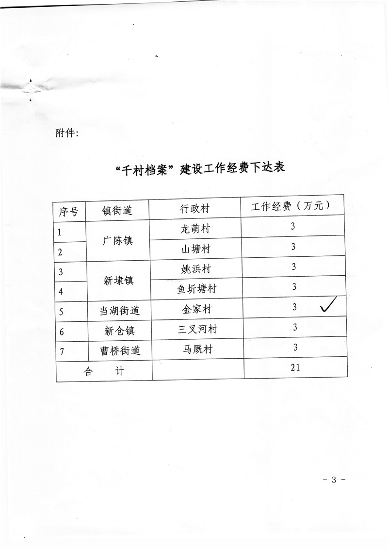 关于下达“千村档案”建设工作经费的通知