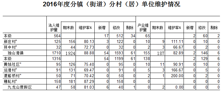 2016年度各镇(街道)名录库更新维护情况总体较好,基层内网维护点全面启动维护,尤其是钟埭街道做到基层用户维护全覆盖。需要改进的问题:1. 部门待处理数据6个,涉及二个镇(区),分别是新仓镇1个,九龙山度假区5个;2.单位维护率总体上仍偏低,地区之间极不平衡,平均维护率低于100%的镇(街道、区)有4个;3.部分镇(街道)对基层工作指导不够,基层内网维护延伸点利用率不高。