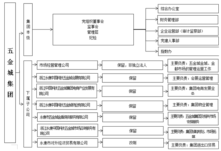 考虑集团混合所有制改制需要,五金城集团下属公司整合基本保持原架构和原管理模式。对业务相近、相互兼岗的下属公司采用“一个机构两块牌子”的合署办公模式。整合后五金城集团下属子公司6家,分公司1家。