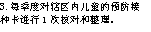发育评估 | 1.不会说自己的名字 2.不会玩“拿棍当马骑”等假想游戏 3.不会模仿画圆 4.不会双脚跳 | 1.不会说带形容词的句子 2.不能按要求等待或轮流 3.不会独立穿衣 4.不会单脚站立 | 1.不能简单叙说事情经过 2.不知道自己的性别 3.不会用筷子吃饭 4.不会单脚跳 | 1.不会表达自己的感受或想法 2.不会玩角色扮演的集体游戏 3.不会画方形 4.不会奔跑 | |
