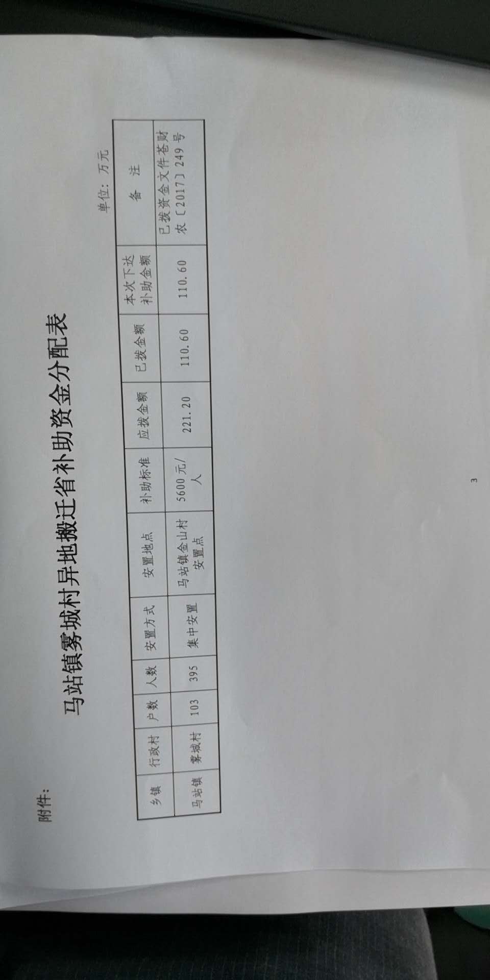 关于下达马站镇雾城村农民异地搬迁省补助资金的通知