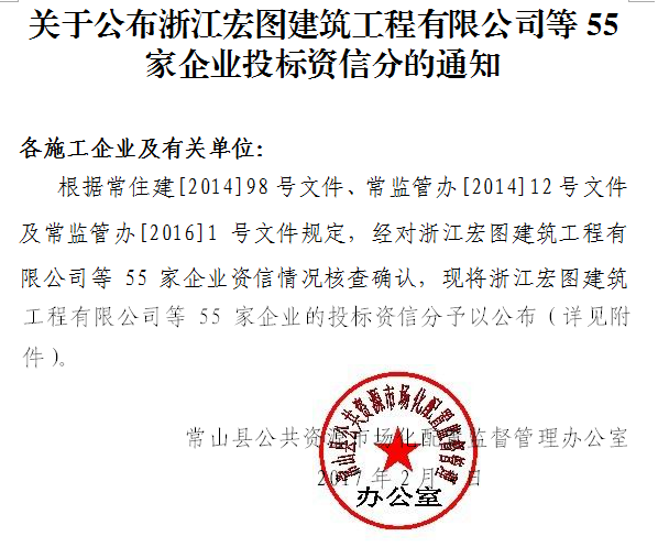 关于公布浙江宏图建筑工程有限公司等55家企业的投标资信分的通知