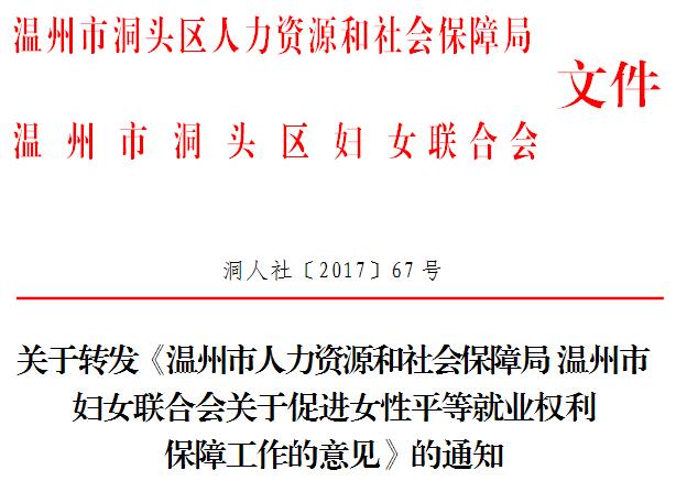 现将《温州市人力资源和社会保障局 温州市妇女联合会关于促进女性平等就业权利保障工作的意见》(温人社发〔2017〕34号)文件转发给你们,请结合实际,认真贯彻执行。