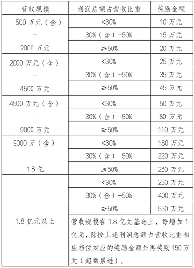 4.支持成长培育。对当年营业收入超过500万元以上的检验检测认证机构,按照营业收入、利润总额占营业收入的比重分类、分档给予资金支持,年支持金额最高不超过1300万元。