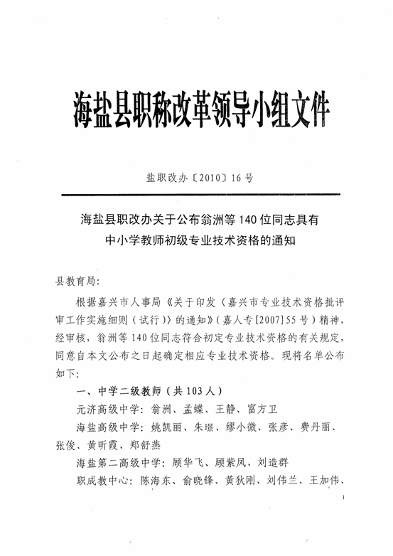 现将《海盐县职改办关于公布翁洲等140位同志具有中小学教师初级专业技术资格的通知》(盐职改办〔2010〕16号)转发给你们,请你校(园)根据本单位岗位实际与晋升对象表现,做好聘任及聘后管理工作。