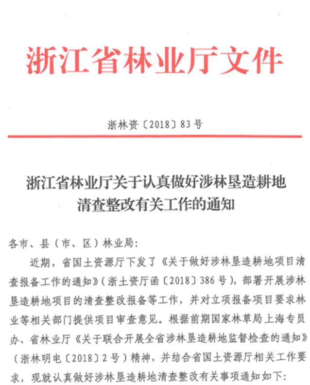 为贯彻落实中央加强生态文明建设的要求,实行最严格的生态环境保护制度,杜绝山上毁林造地、影响和破坏生态环境。根据浙江省林业厅《关于认真做好涉林垦造耕地清查整改有关工作的通知》(浙林资〔2018〕83号)文件精神,对全区2015年1月1日至2018年8月31日以来垦造耕地项目涉林进行清查,重点检查涉林垦造耕地项目的选址范围、采伐审批、植被恢复情况,以及近年来媒体曝光或群众举报的违规涉林垦造耕地整改情况。请于2018年11月7号前将清查情况报送至区农林局林政资源科,传真:84125390,并报送电子稿邮箱747109558@qq.com。望各镇(街道)要认真履行好森林资源管理的属地责任,切实加强森林资源的保护管理。