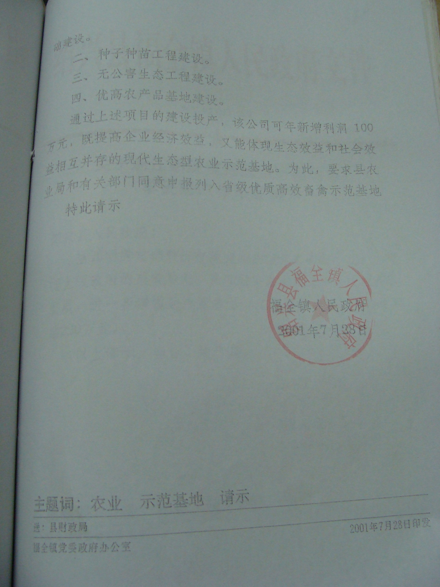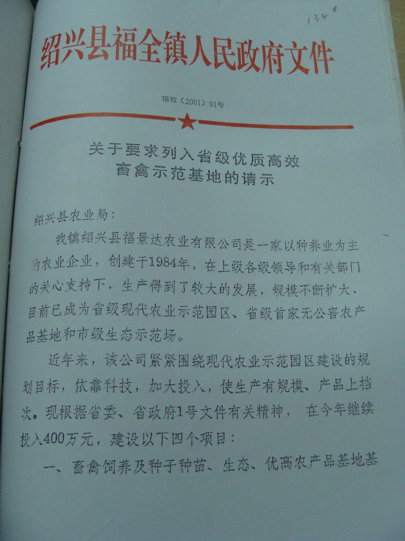 关于要求列入省级优质高效畜禽示范基地的请示