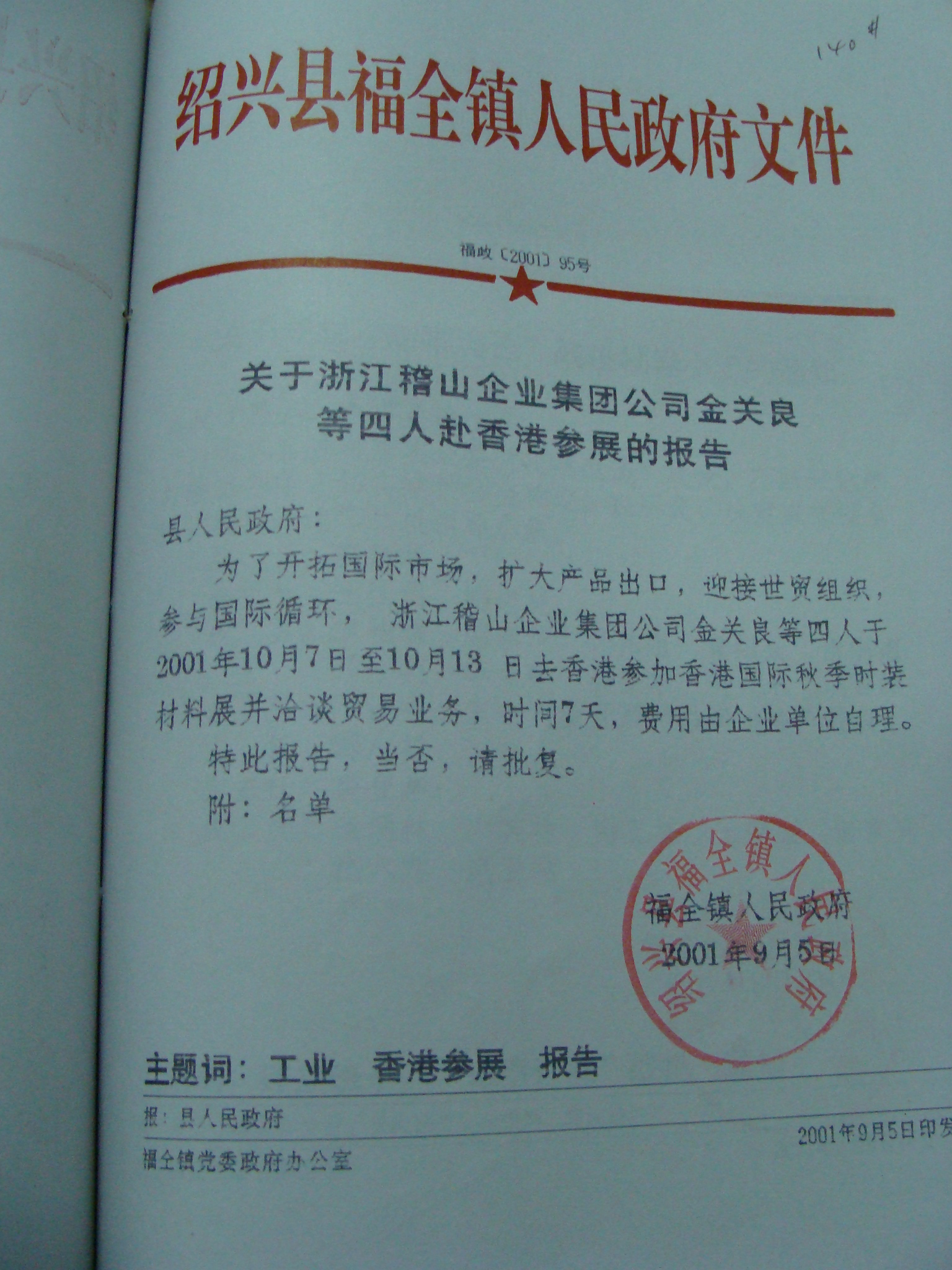 关于浙江稽山企业集团公司金关良等四人赴香港参展的报告