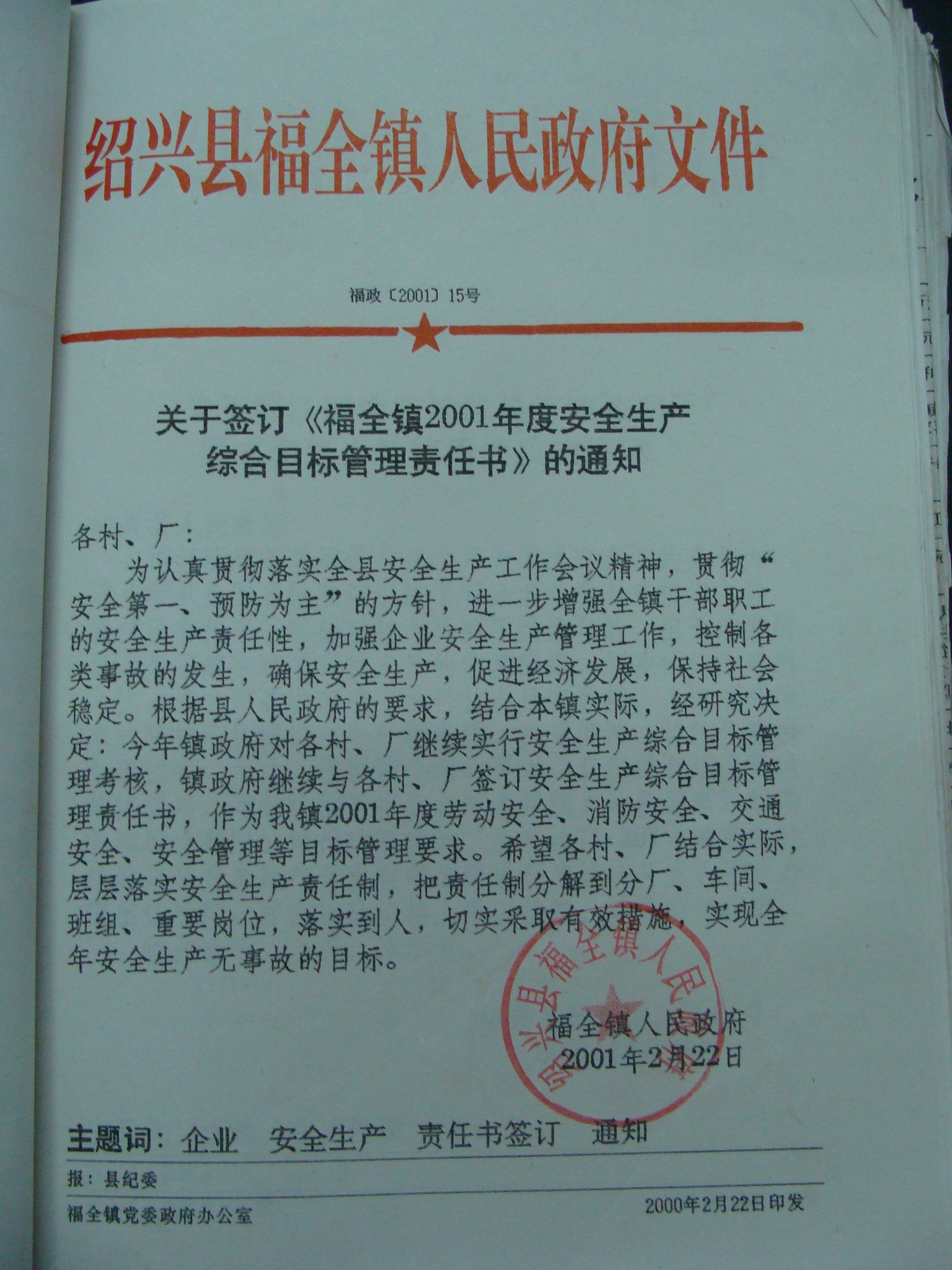 关于签订《福全镇2001年度安全生产综合目标管理责任书》的通知