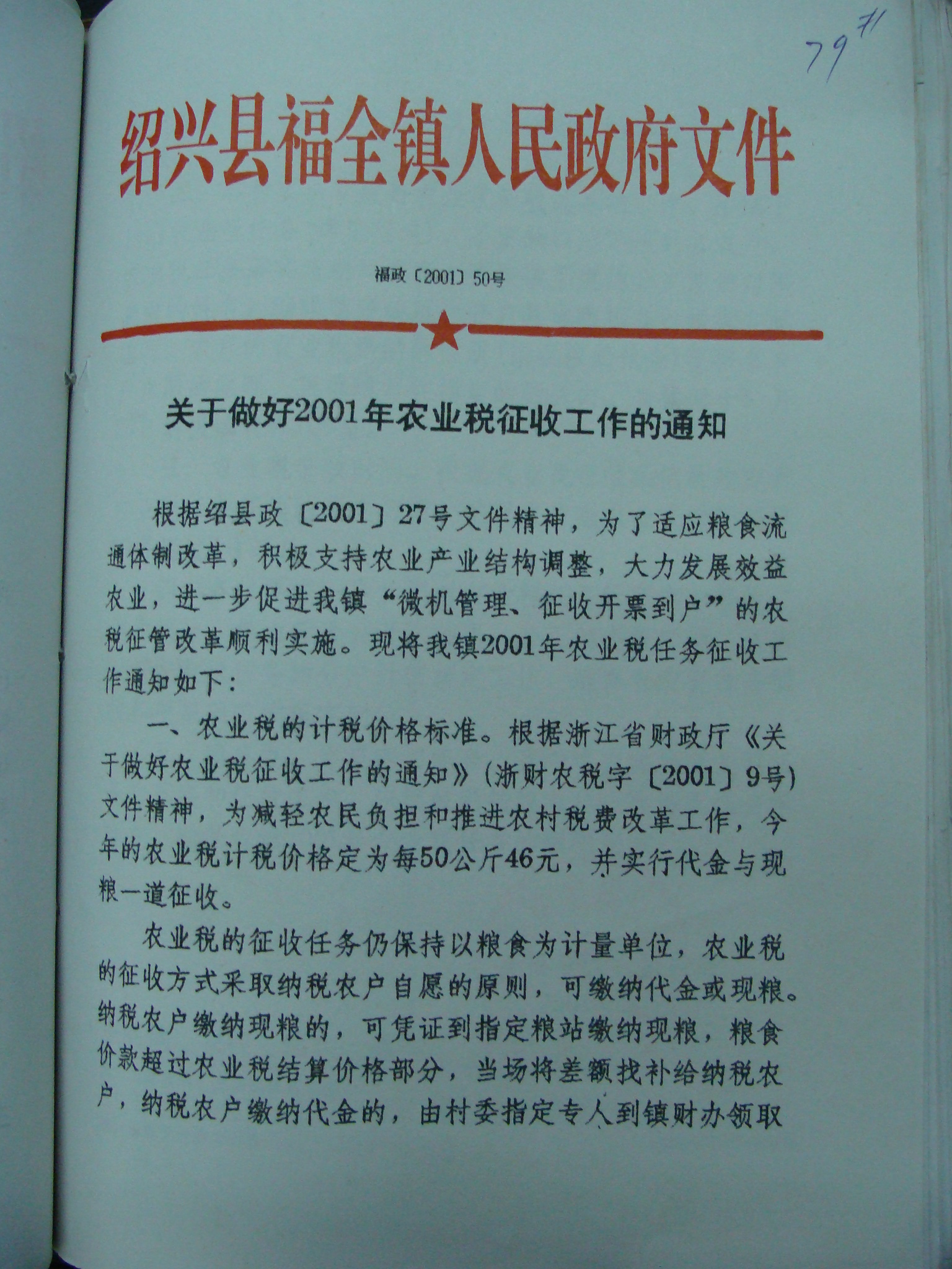 关于做好2001年农业税征收工作的通知