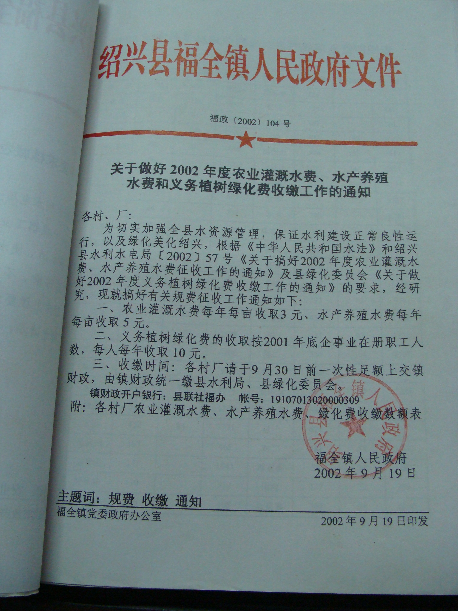 关于做好2002年度农业灌溉水费、水产养殖水费和义务植树绿化费收缴工作的通知