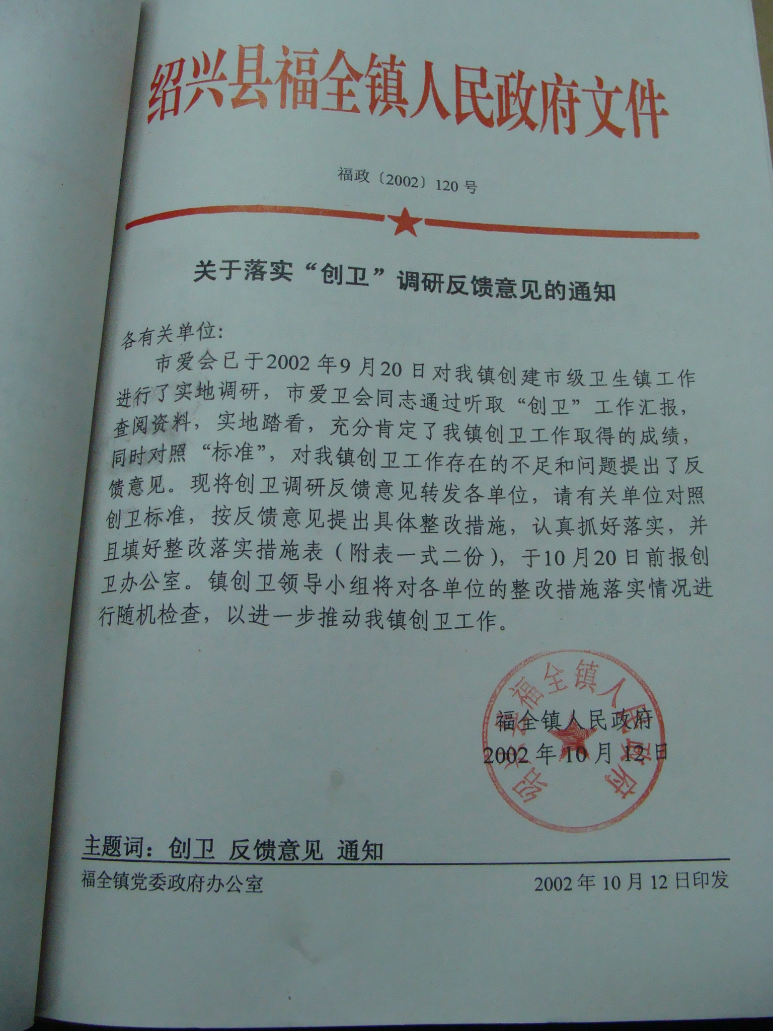 关于落实创卫调研反馈意见的通知