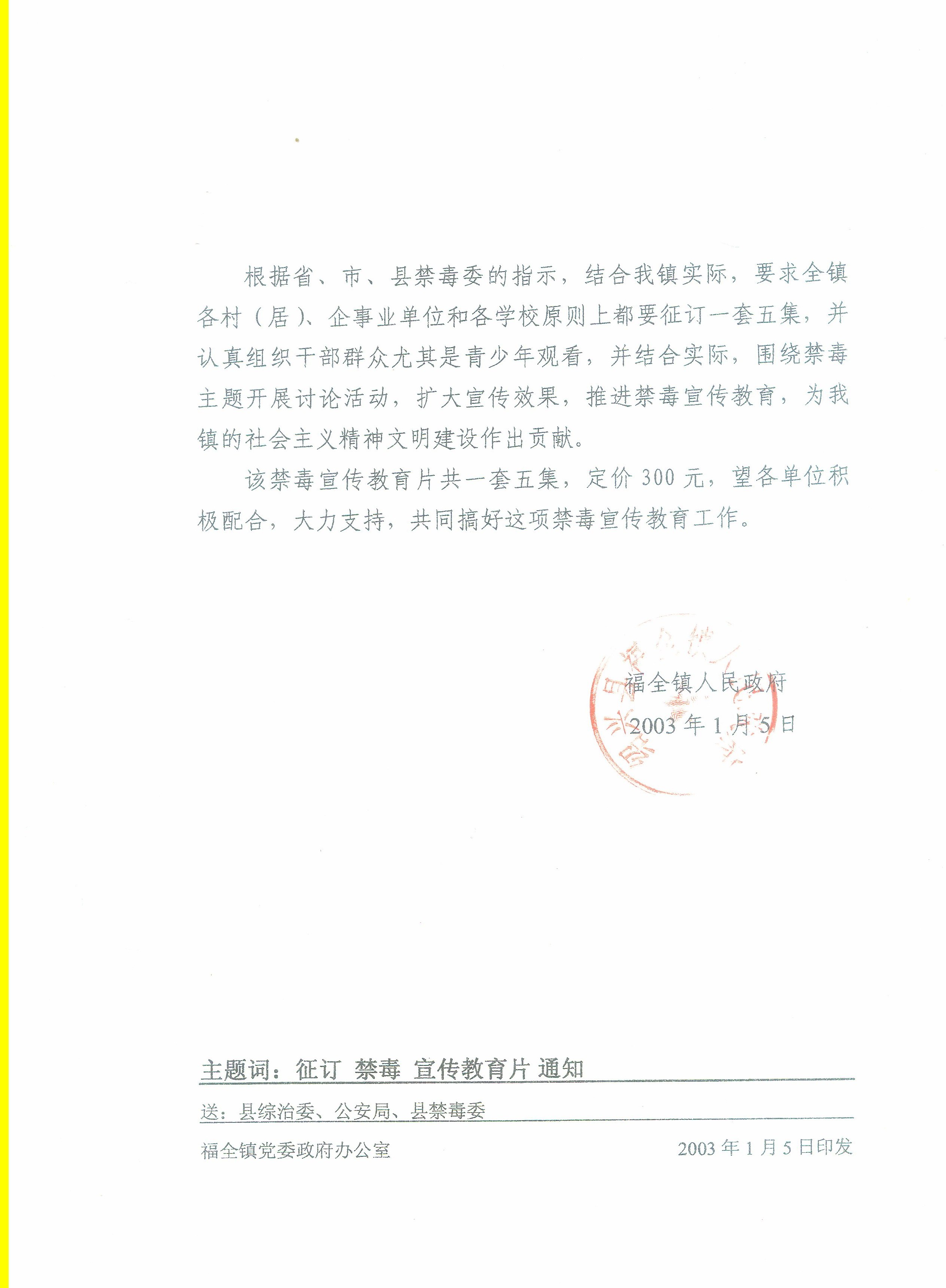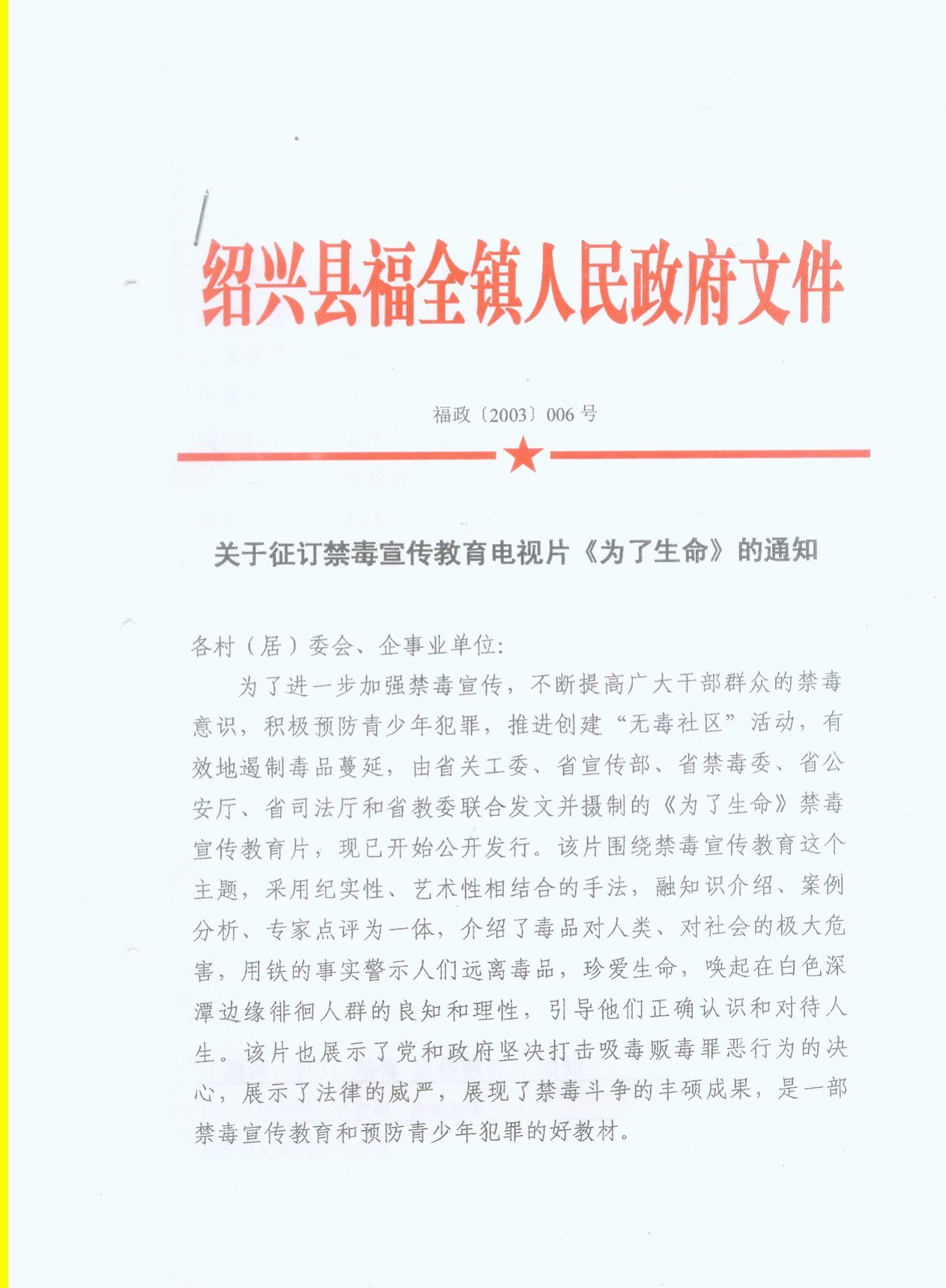 关于征订禁毒宣传教育电视片《为了生命》的通知