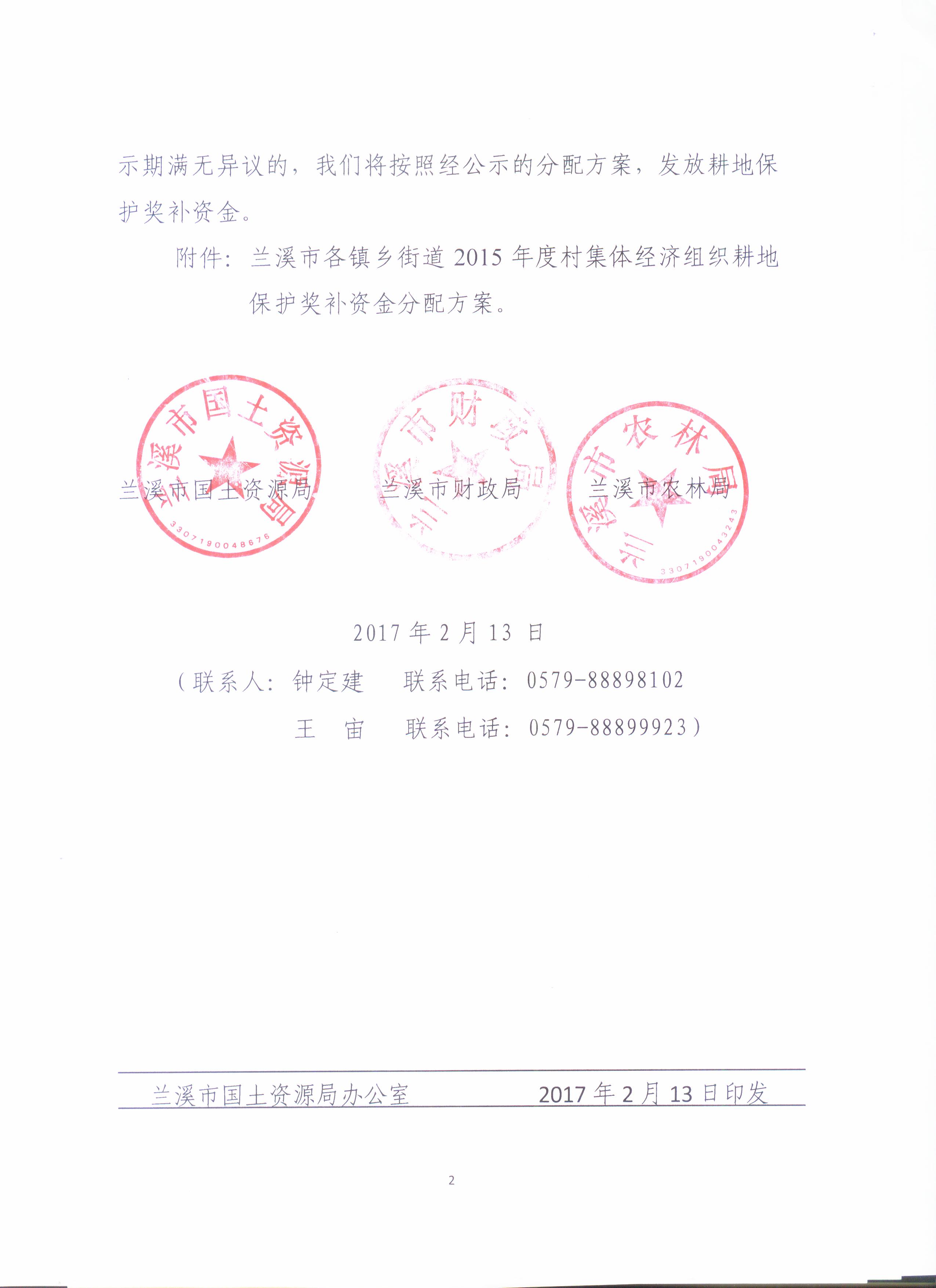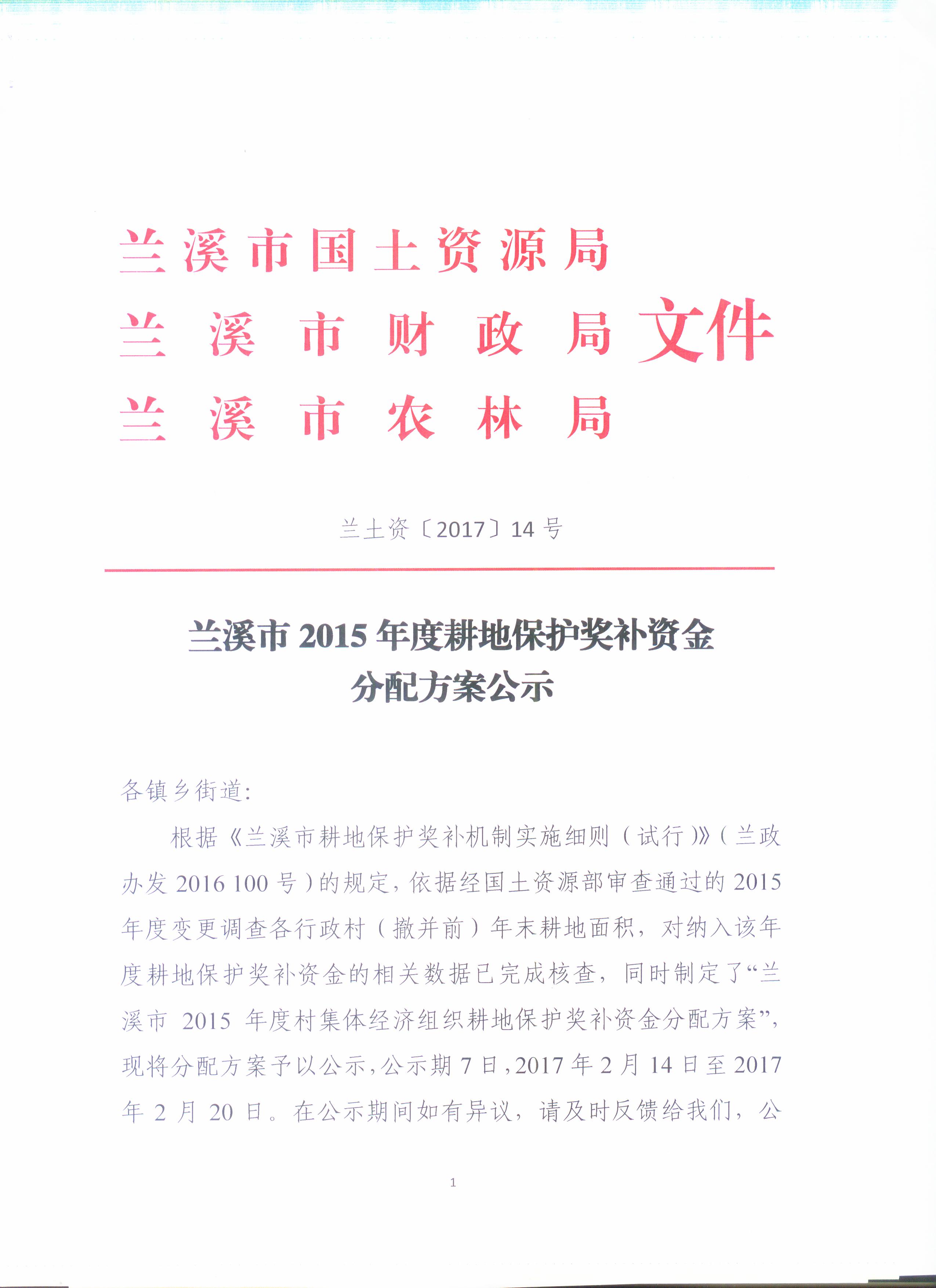 兰溪市2015年度耕地保护奖补资金分配方案公示