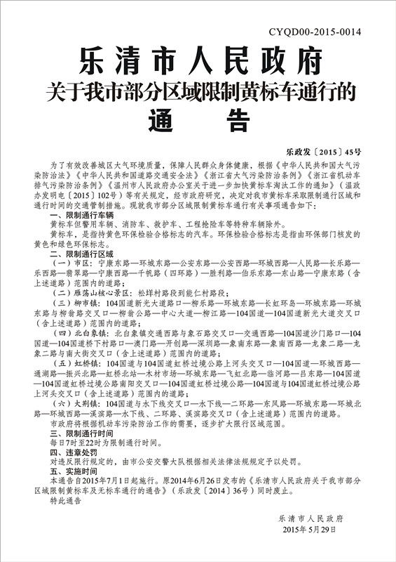 乐清市人民政府关于我市部分区域限制黄标车通行的通告