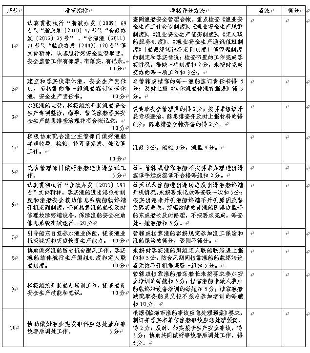为进一步深化渔业安全生产社会化管理,根据《中共浙江省委、浙江省人民政府关于进一步加强安全生产工作的意见》(浙委〔2009〕88号)、《浙江省人民政府办公厅关于进一步加强渔业安全生产工作的通知》(浙政办发〔2009〕69号)、《关于进一步加强企业安全生产工作的通知》(浙政发〔2010〕47号)、《关于加强渔业安全生产监管工作的意见》(台政办发〔2012〕25号)和《临海市人民政府办公室关于切实加强渔业安全生产管理工作的实施意见》(临政办〔2009〕120号)等文件的要求,切实加强基层渔业安全生产管理组织建设,分解落实渔船安全生产管理责任,提高渔业安全生产防范意识,落实渔业安全生产各项防范措施,预防和减少各类事故发生,落实基层渔业安全生产管理组织职责,保障渔民生命财产安全。特制定本考核办法。