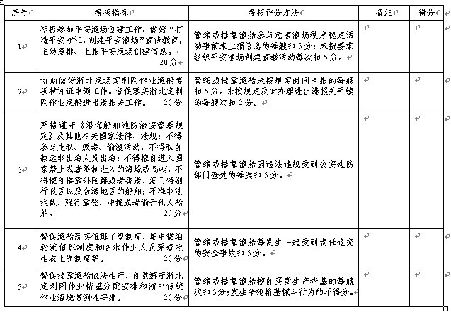(二)考核得分在沿海各渔业村、港闸口和渔政分站等渔民集聚场所进行公布,引导渔民择优选择挂靠渔业服务公司(渔业村)。