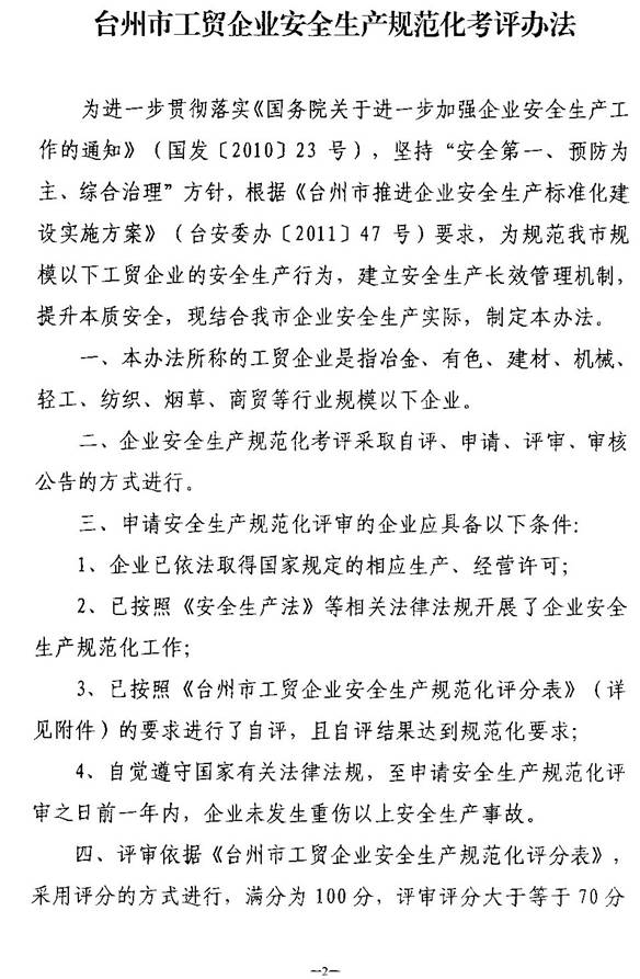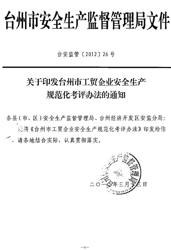 现将台州市安全生产监督管理局关于《台州市工贸企业安全生产规范化考评办法》(台安监管〔2012〕26号)转发给你们,请贯彻执行。