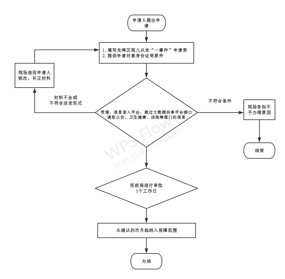 线下办理模式:孤儿监护人或近亲属到孤儿户籍所在地街道办事处申请,填写《龙湾区孤儿认定“一件事”申请表》并提供孤儿本人身份证明原件;街道儿童督导员负责受理并上传平台,借助大数据共享平台接口获取所需材料;民政部门根据平台中传输的信息进行审批。对符合条件的孤儿,从确认的次月起纳入保障范围。