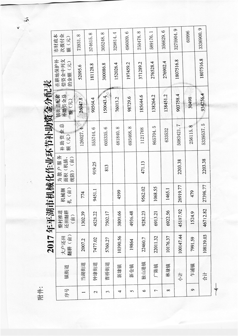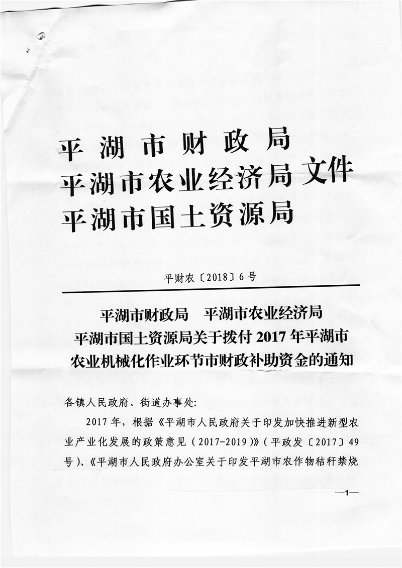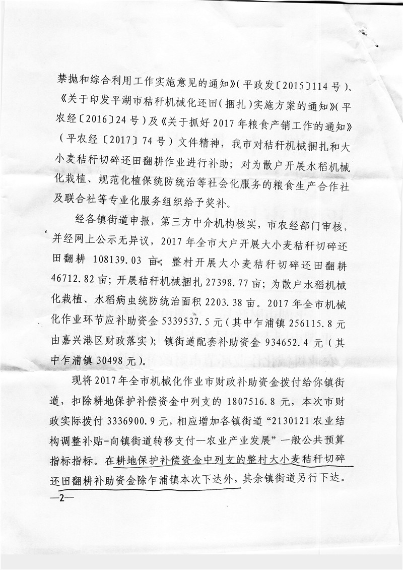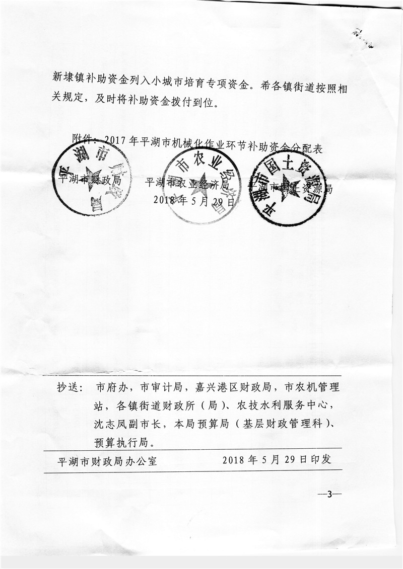 关于拨付2017年平湖市农业机械化作业环节市财政补助资金的通知