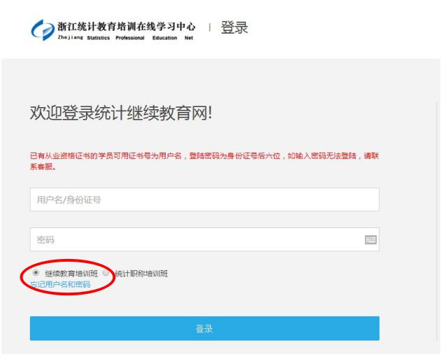 3.注册完成之后,再次进入网站:www.zhejiang.statsedu.com,点击“用户登录”,输入用户名和密码,选择“继续教育培训班”进入学习。