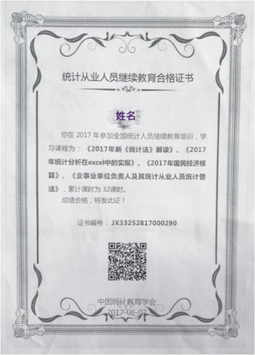 3、“统计从业人员继续教育合格证书“样板