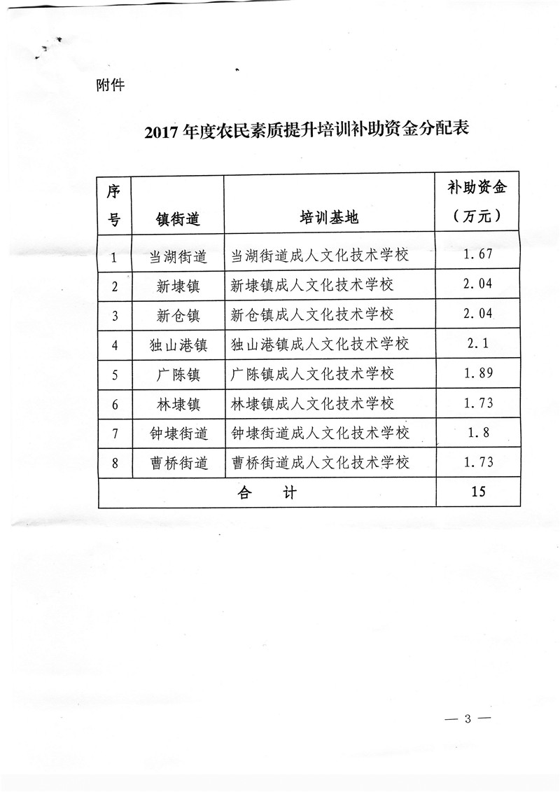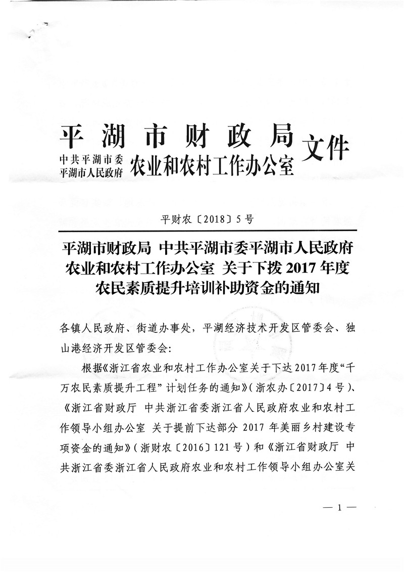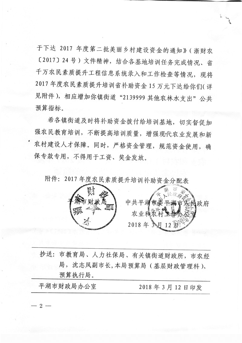 关于下拨2017年度农民素质提升培训补助资金的通知