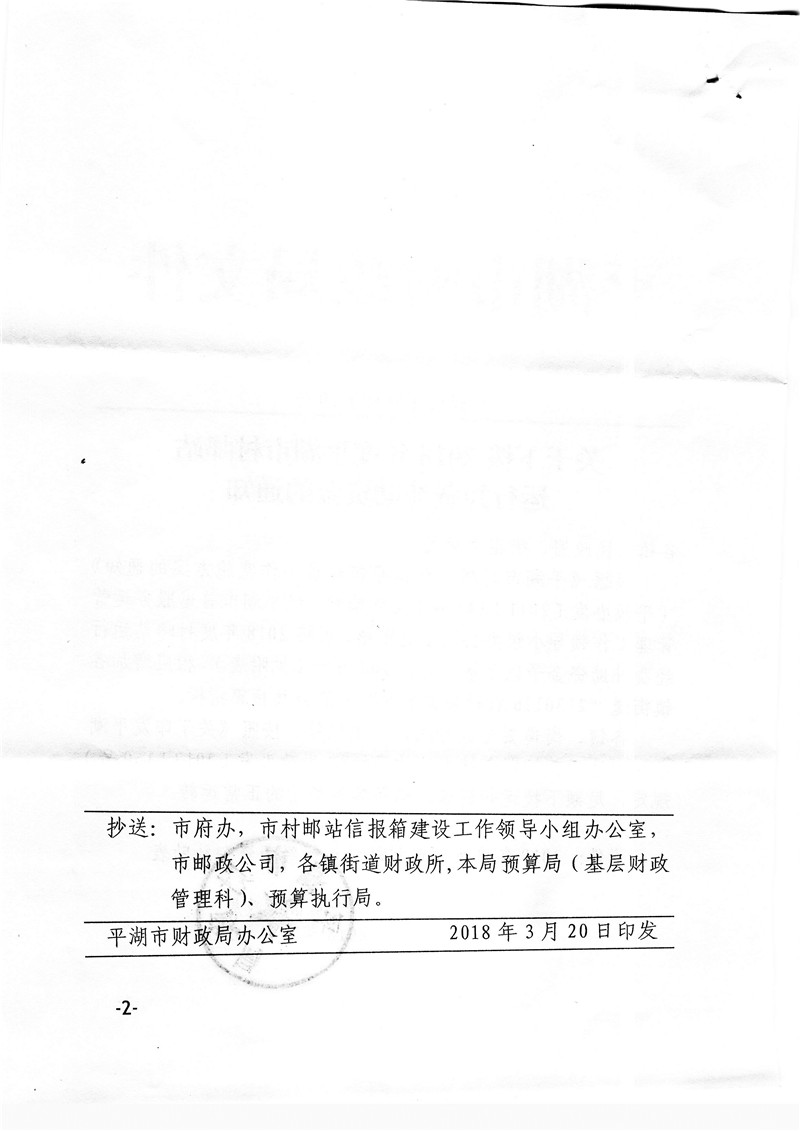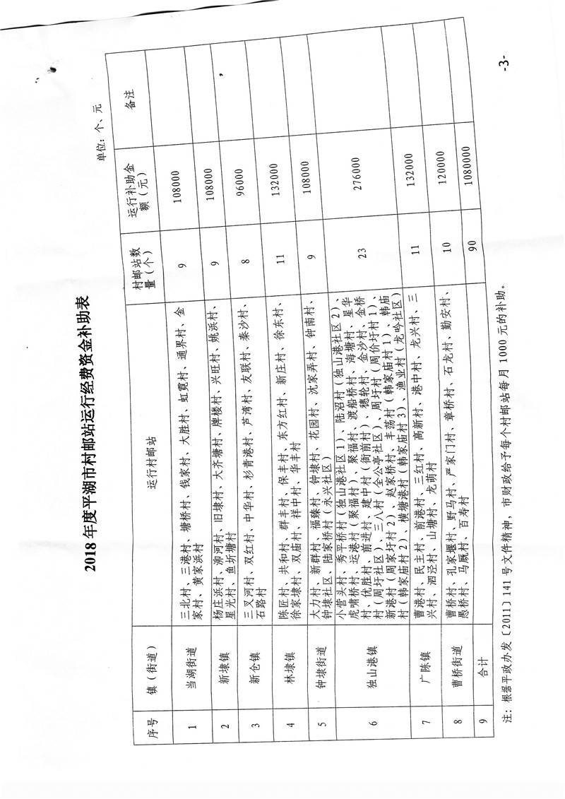 关于下拨2018年度平湖市村邮站运行经费补助资金的通知