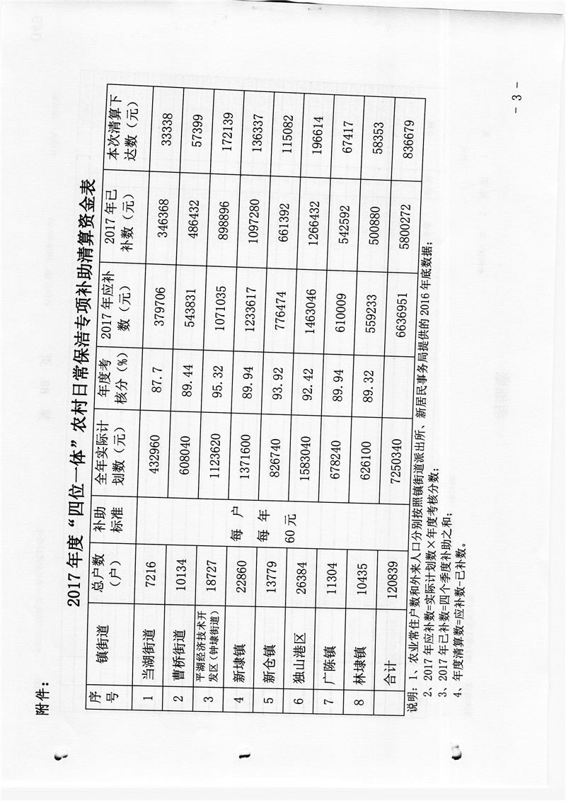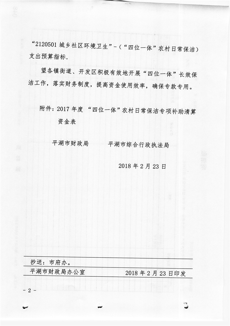 关于下达2017年度平湖市农村日常保洁财政补助清算资金的通知