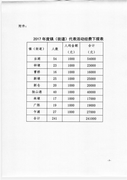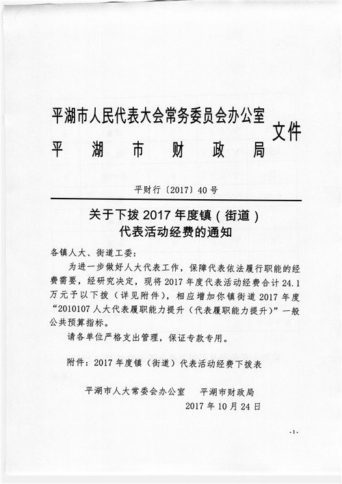 关于下拨2017年度真(街道)代表活动经费的通知