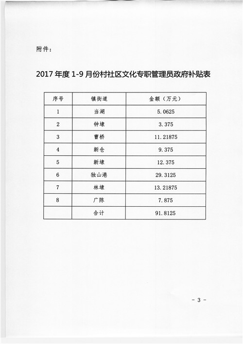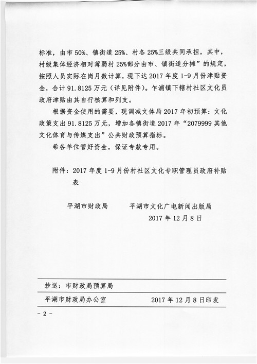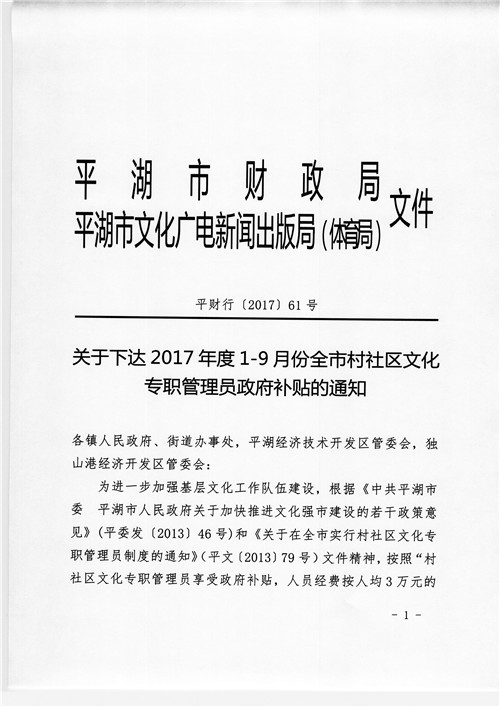 关于下达2017年度1-9月份全市村社区文化专职管理员政府补贴的通知