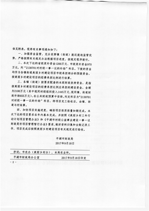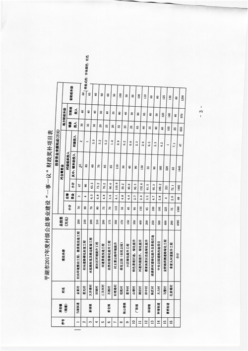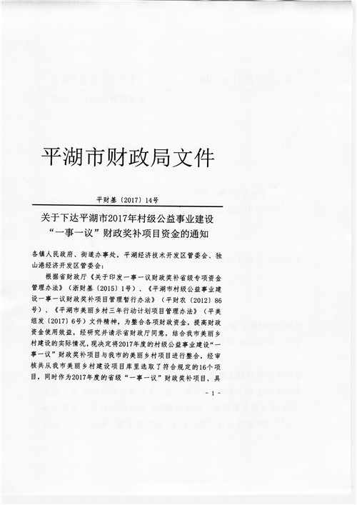 平湖市2017年村级公益事业建设“一事一议”财政奖补项目资金