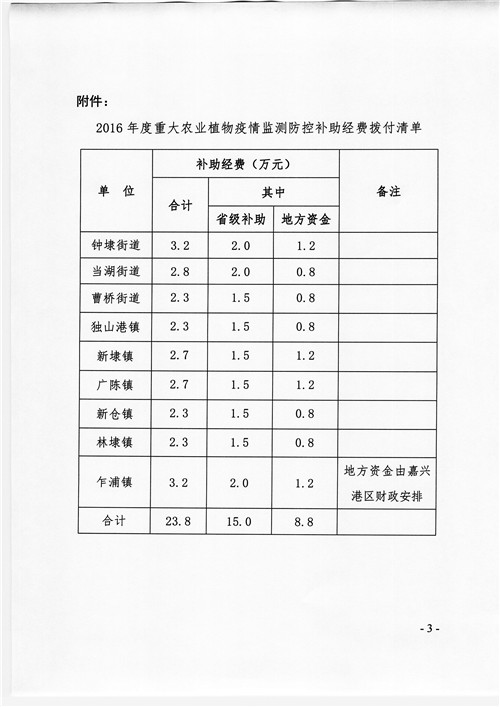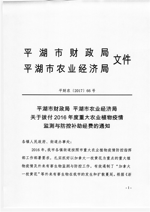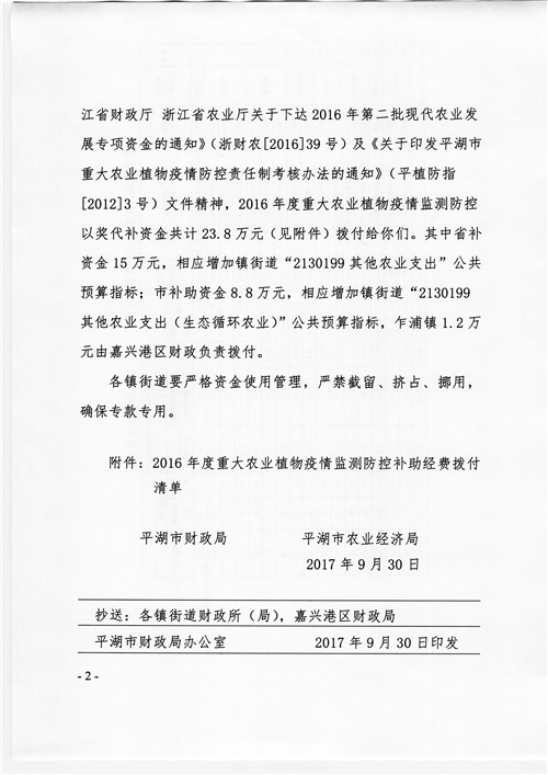 拨付2016年度重大农业植物疫情监测与防控补助经费(生态循环农业)