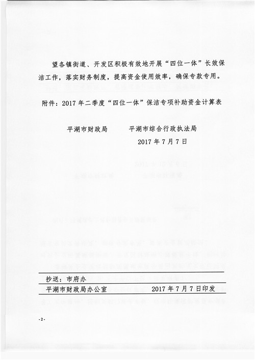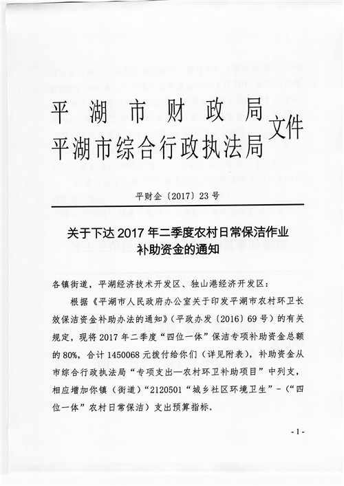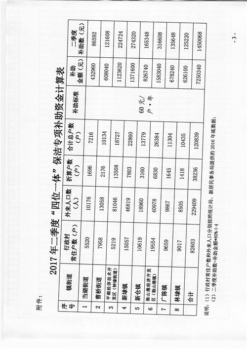 2017年二季度农村日常保洁作业补助资金