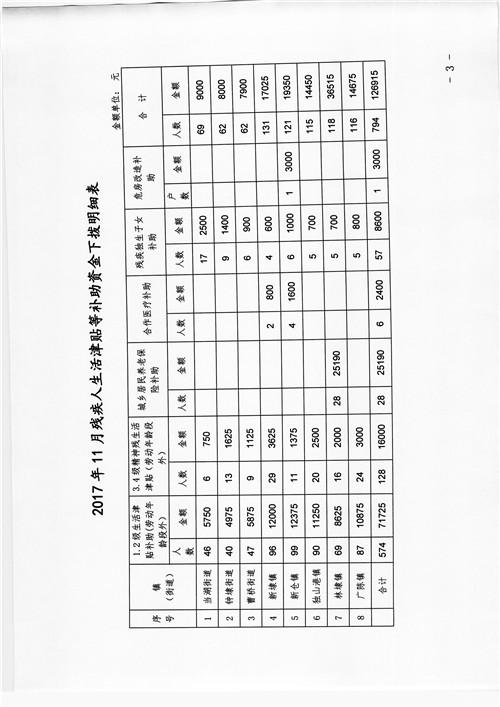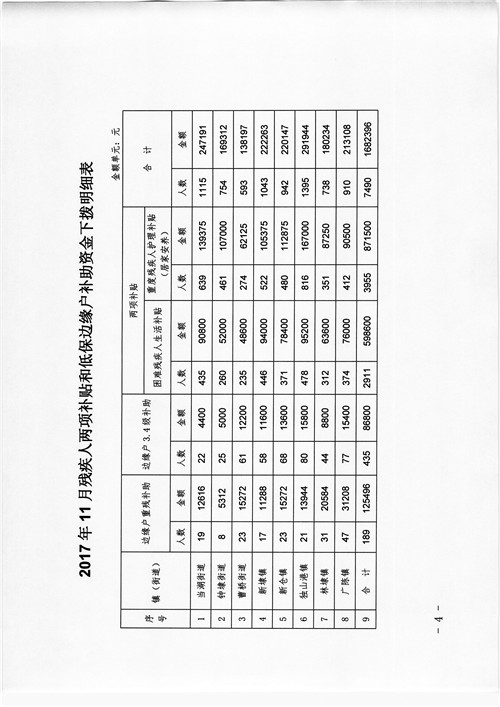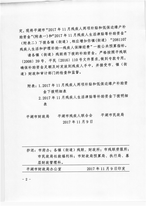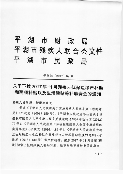 关于下拨2017年11月残疾人低保边缘户补助和两项补贴以及生活津贴等补助资金的通知