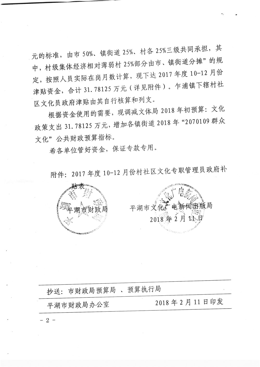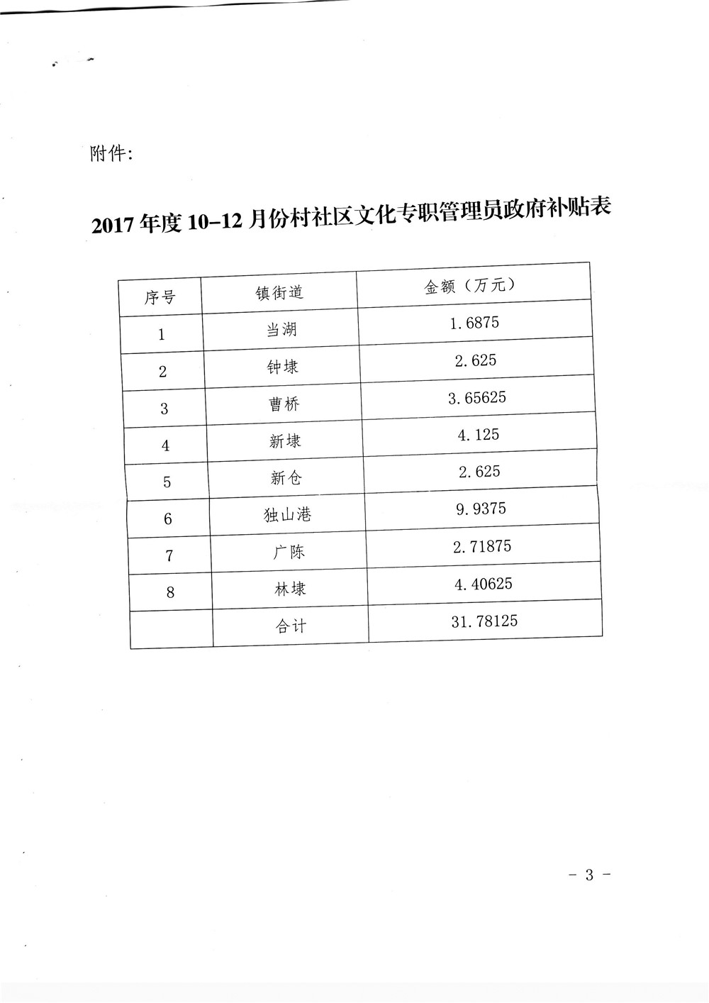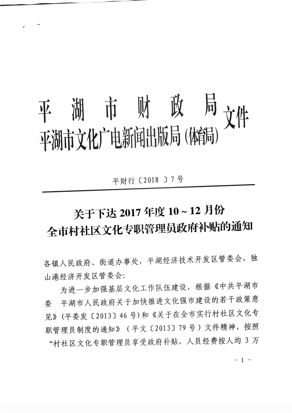 关于下达2017年度10-12月份全市村社区文化专职管理员政府补贴的通知