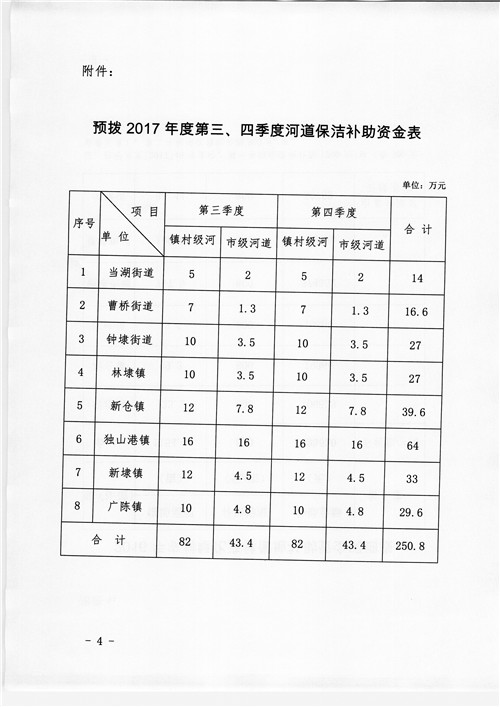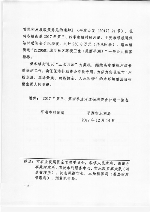 2017年度第三、第四季度河道保洁补助资金