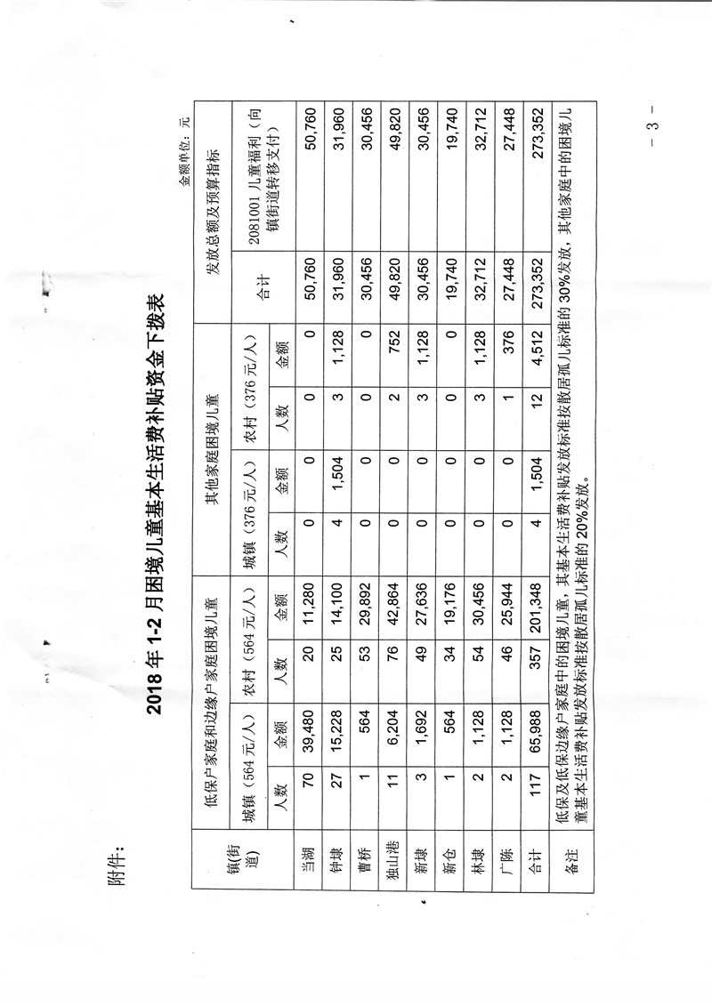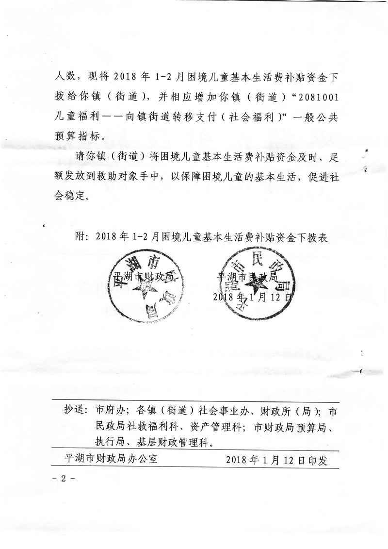 关于下拨2018年1-2月困境儿童基本生活费补贴资金的通知