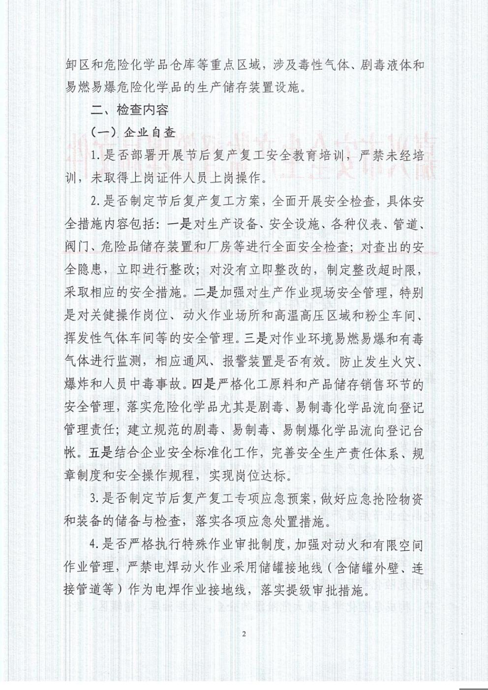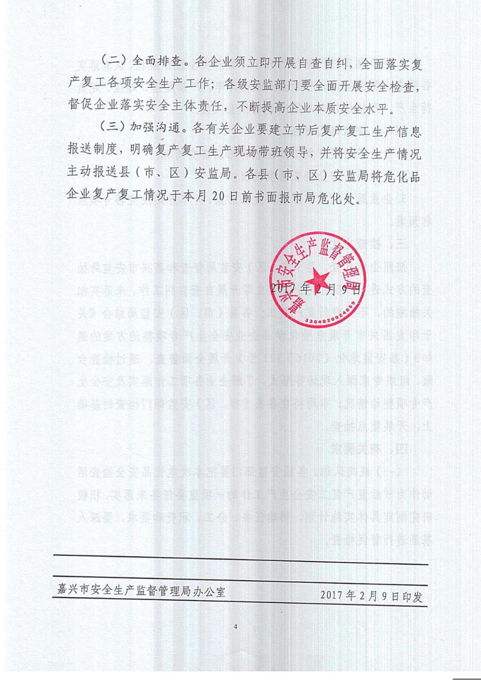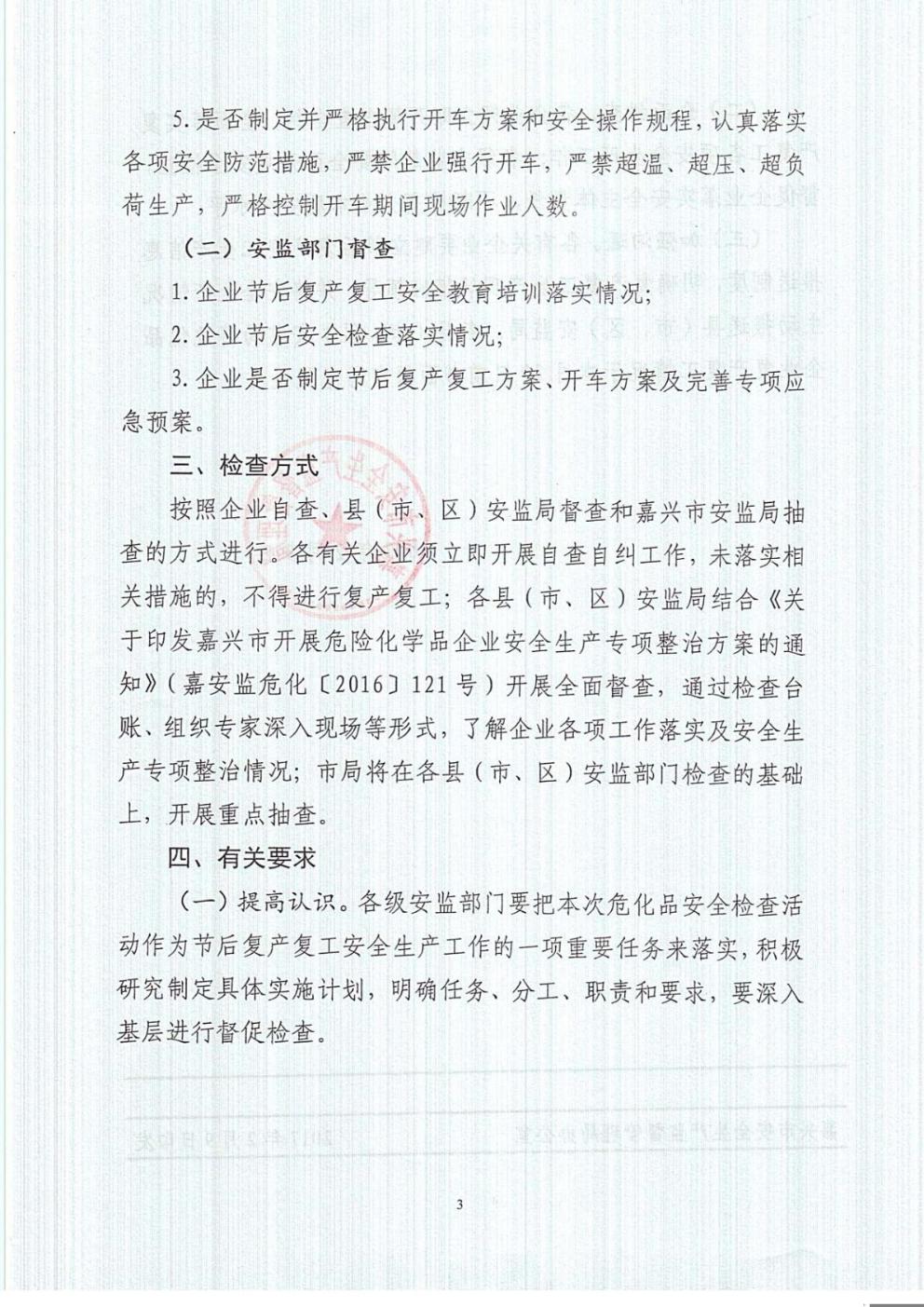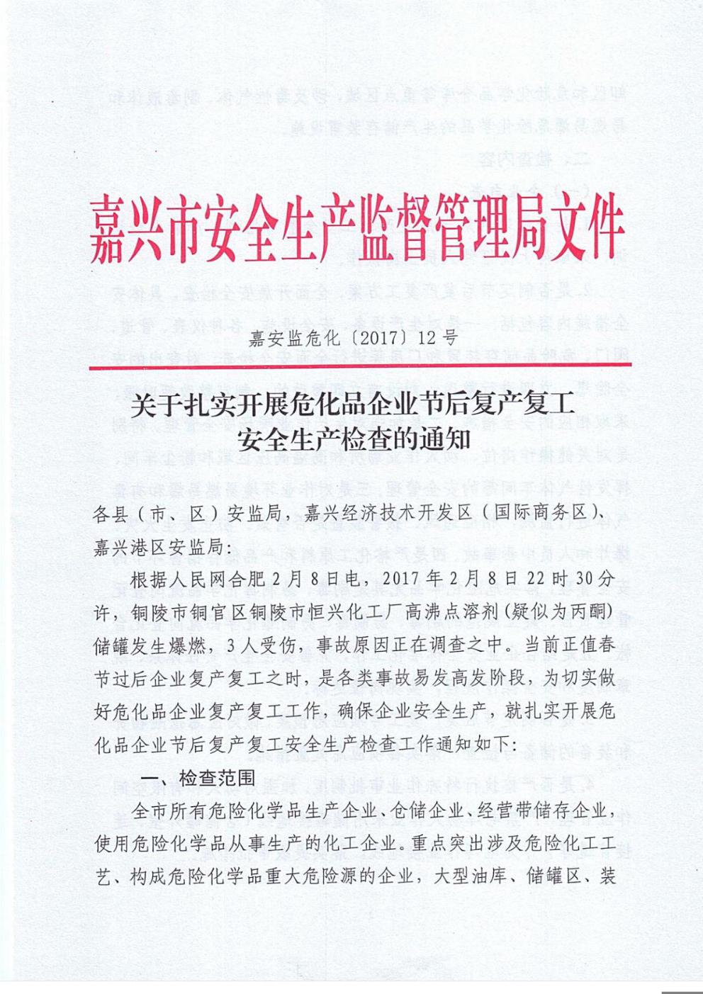 节后复产复工安全生产工作是一项重要任务,现将《嘉兴市安全生产监督管理局关于扎实开展危化品企业节后复查复工安全生产检查的通知》(嘉安监危化[2017]12号)文件转发给你们,请你们结合自身实际,按照文件要求,深入督促辖区内危化品企业立即开展自查自纠,全面落实复产复工各项安全生产工作,并将危化品企业复产复工情况于17日前书面报市局危化科。