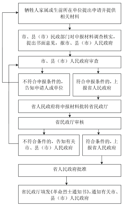 一 、由死者生前所在单位、死者遗属或者事件发生地的组织、公民向死者生前工作单位所在地、死者遗属户口所在地或者事件发生地的县级人民政府民政部门提供有关死者牺牲情节的材料,由收到材料的县级人民政府民政部门调查核实后提出评定烈士的报告,报本级人民政府审核。