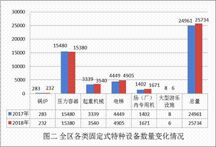 1.设备情况:截止2018年12月底,全区现有在册固定式特种设备25734台(套),其中锅炉232台,压力容器15380台,起重机械3540台,电梯4905台,场(厂)内专用机动车辆1671台,大型游乐设施6台。总数与去年同期基本持平,其中锅炉数量下降较为明显,电梯数量保持10%左右的增长。全区各类固定式特种设备数量及变化情况如图一、图二所示: