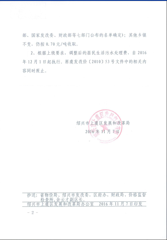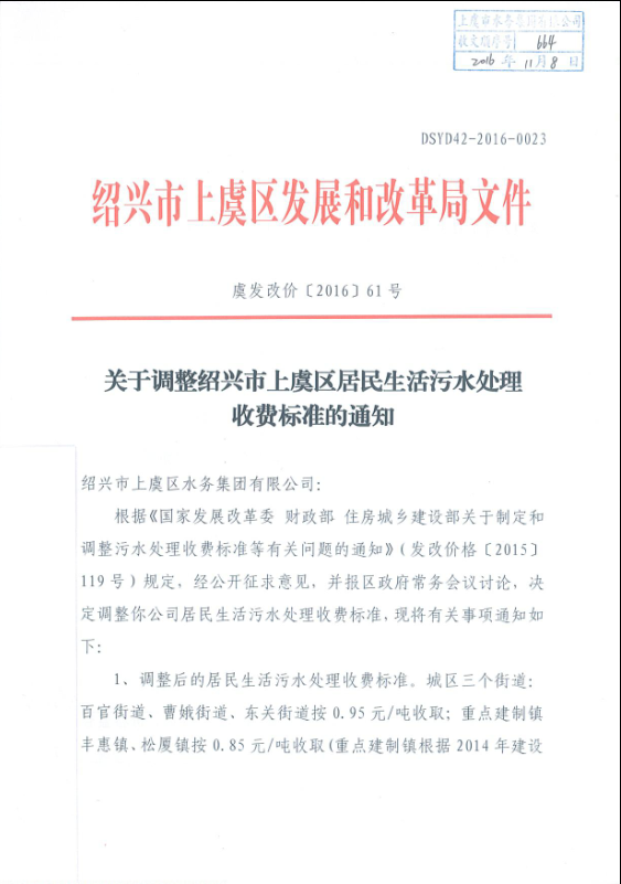 虞发改价【2016】61号《关于调整绍兴市上虞区居民生活污水处理收费收费标准的通知》
