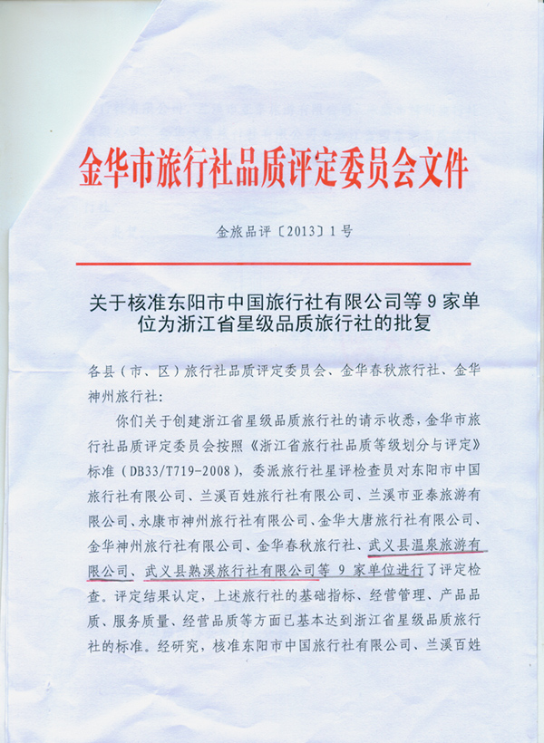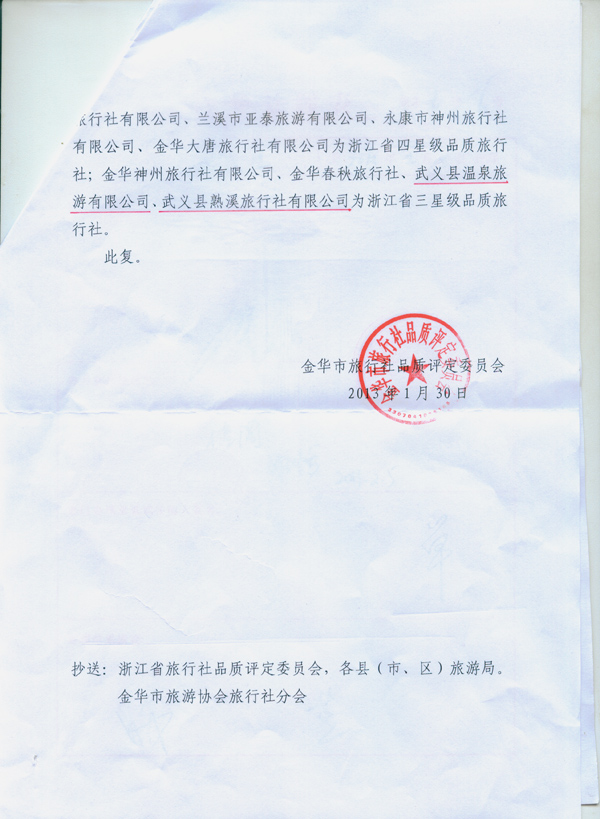 温泉、熟溪旅行社被评为浙江省三星级品质旅行社文件