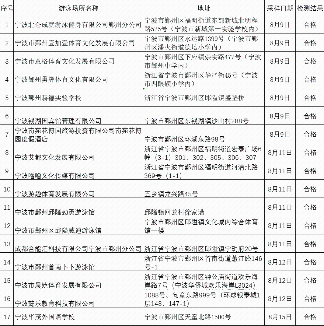 炎炎夏日,游泳成了大家避暑降温的方式之一,为保障我区游泳场所水质卫生安全,鄞州区卫生监督所对游泳场所开展夏季保健康专项监督检查和水质抽检工作。水质检测项目包括泳池水浑浊度、pH、游离性余氯、尿素、细菌总数、大肠菌群以及浸脚池水游离性余氯。第三轮第二批共抽检游泳场所17家,合格17家,合格率为100%,现将抽检结果公示如下: