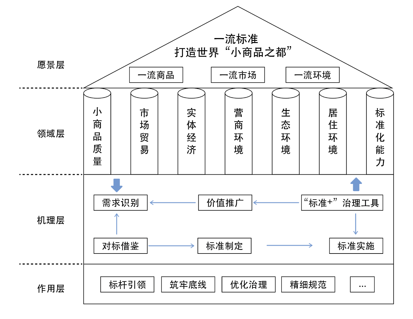 愿景层提出以一流标准打造世界“小商品之都”的发展愿景,明确打造一流商品质量,一流市场服务,一流城市环境三大目标。