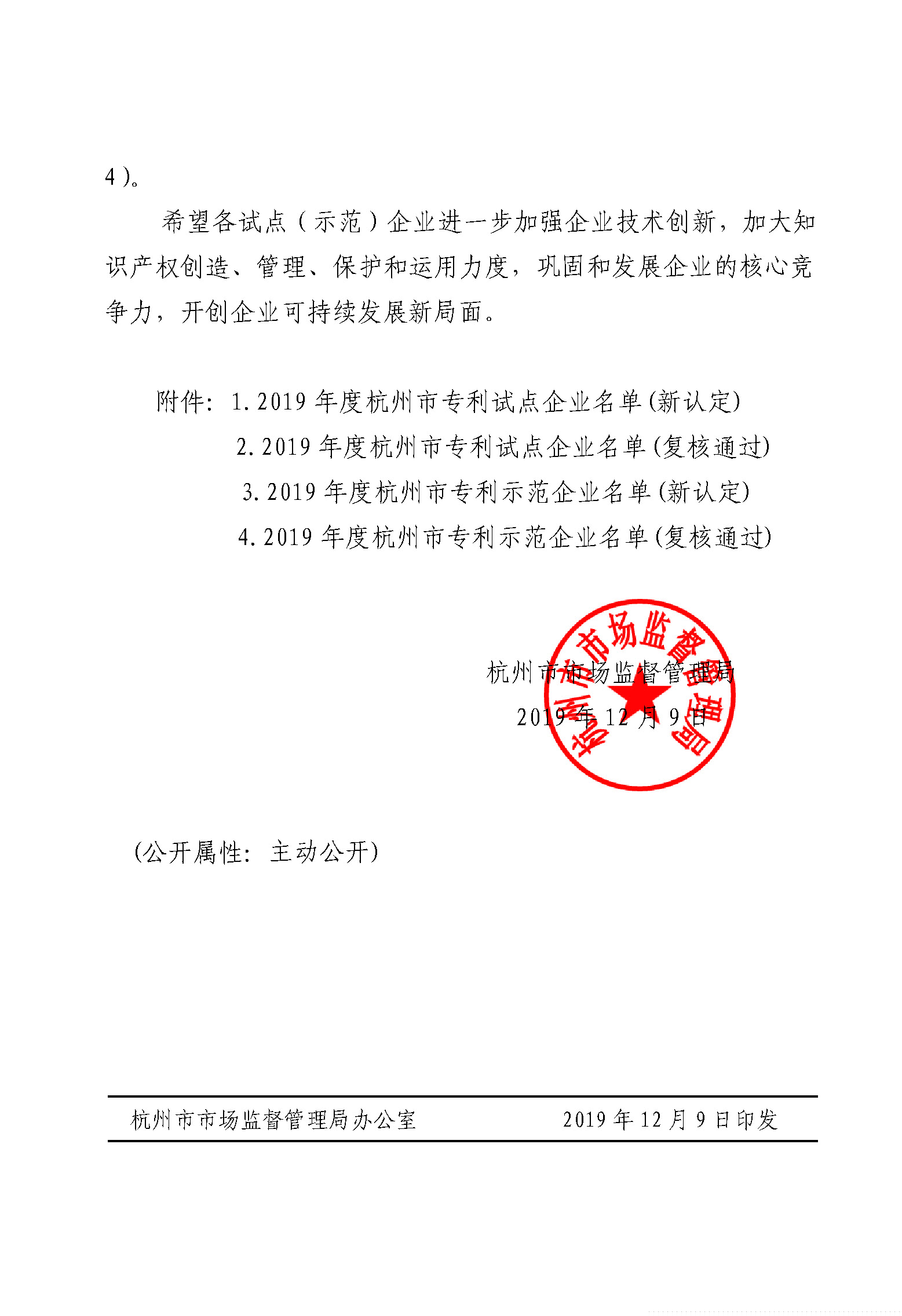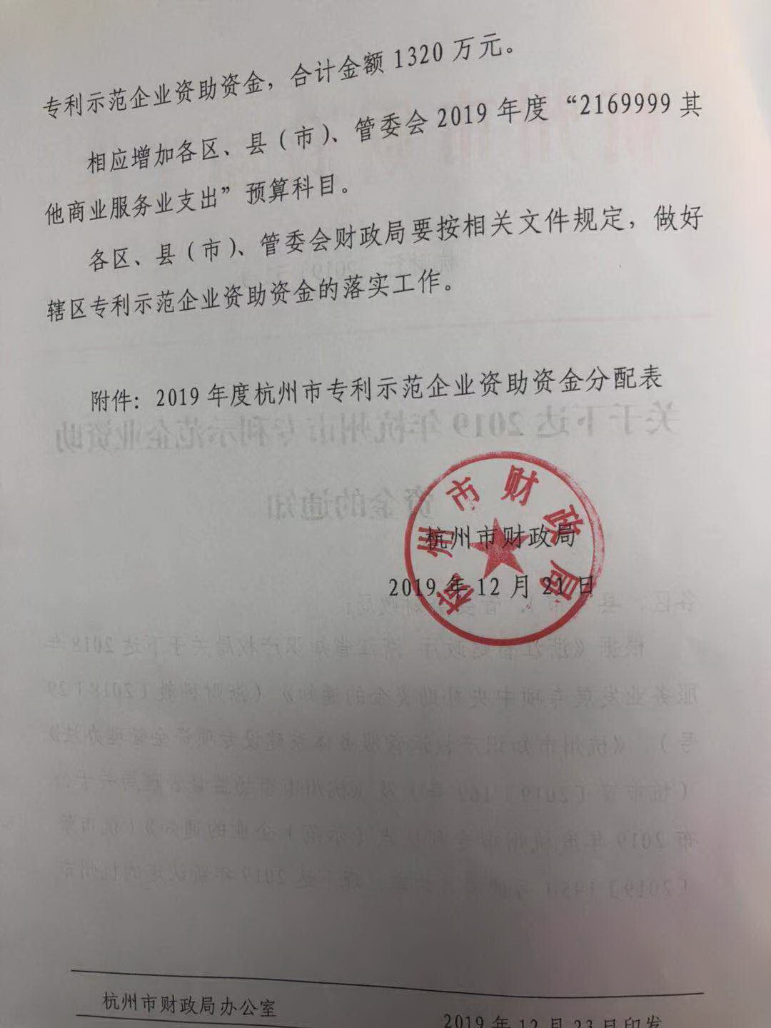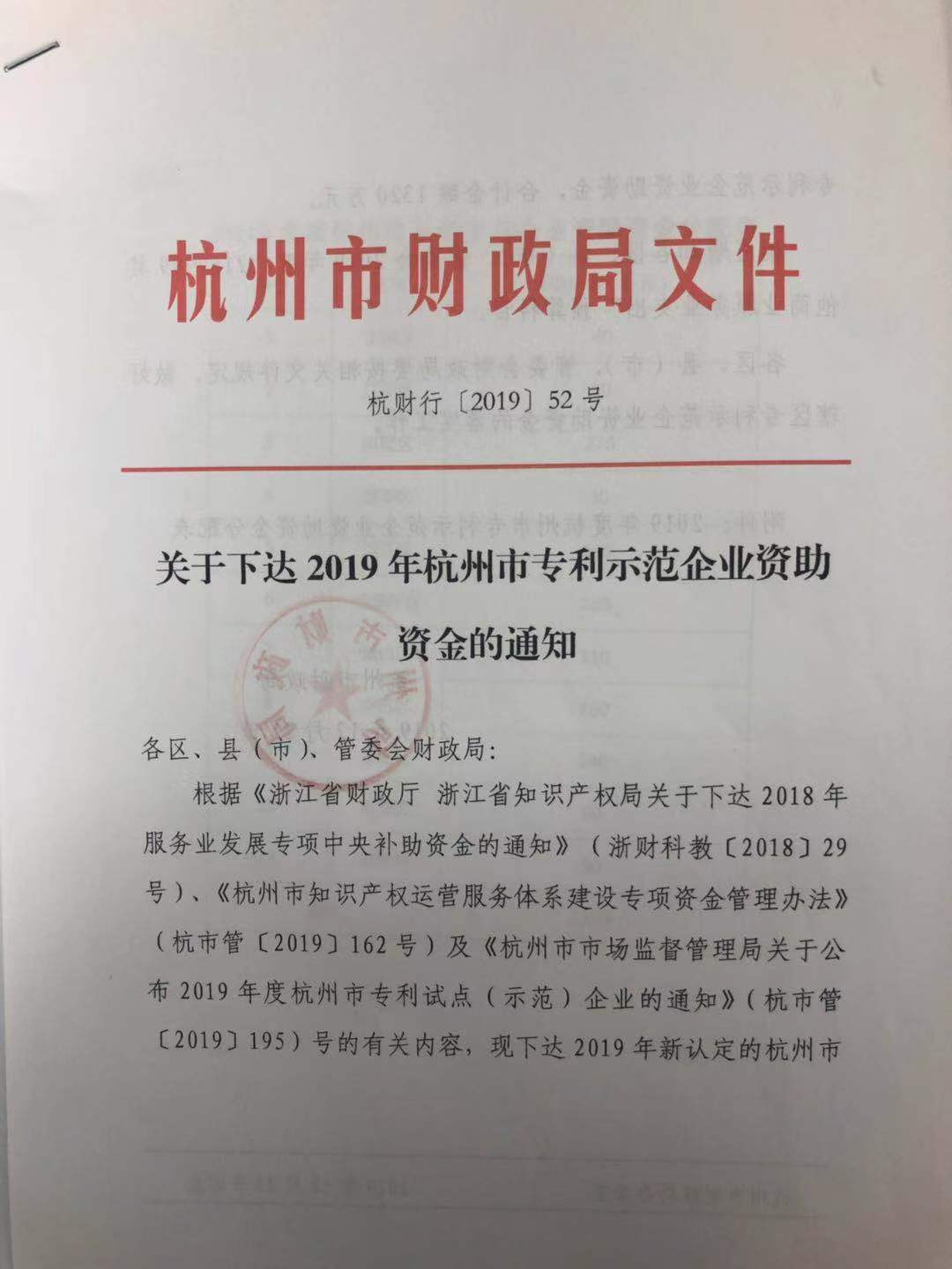 根据杭州市财政局《关于下达2019年杭州市专利示范企业资助资金的通知》(杭财行〔2019〕52号)和杭州市市场监督管理局《关于公布2019年度杭州市专利试点(示范)企业的通知》(杭市管〔2019〕195号)文件规定,明确了2019年我区新认定的杭州市专利示范企业名单和资助金额。现经主管部门审核,决定对同盾控股有限公司等16家企业进行资助,共计资助资金160万元(详见附件1)。